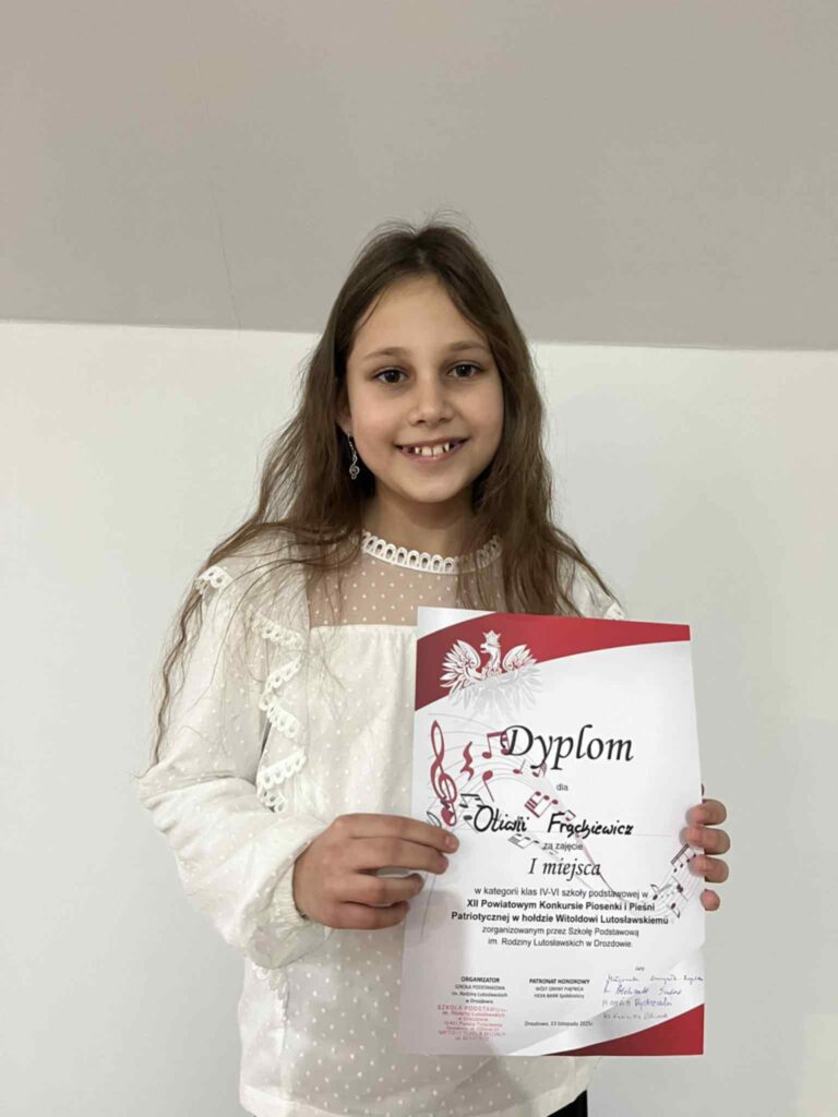 w kategorii klas IV–VI w XII Konkursie Piosenki i Pieśni Patriotycznej „W hołdzie Witoldowi Lutosławskiemu”, organizowanym przez Szkołę Podstawową im. Rodziny Lutosławskich w Drozdowie ![]()