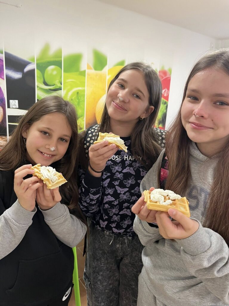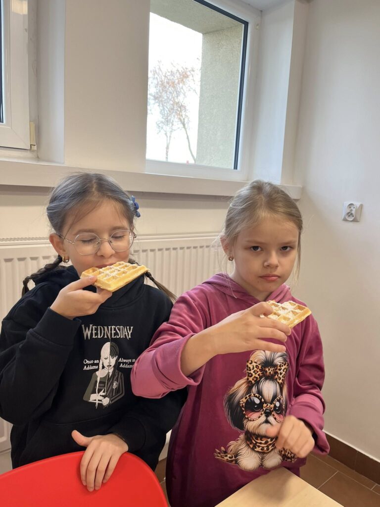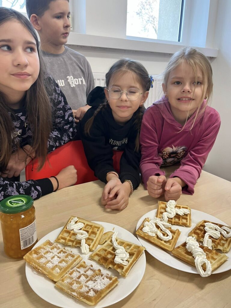 Było pysznie, zdrowo i bardzo rodzinnie — z radością częstowaliśmy innych uczniów, których do jadalni przyciągnął zapach świeżo wypiekanych gofrów. ![]()
